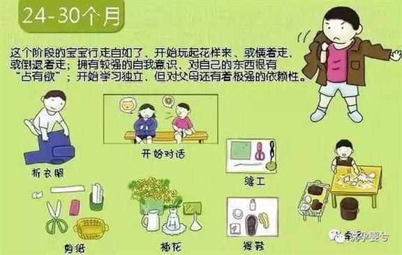 宝宝开始能够独立的穿衣服、叠衣服,并且能够帮助做一些简单的家务,像是擦鞋等等。语言的能力能够进一步的提升,能够跟别人进行对话。
