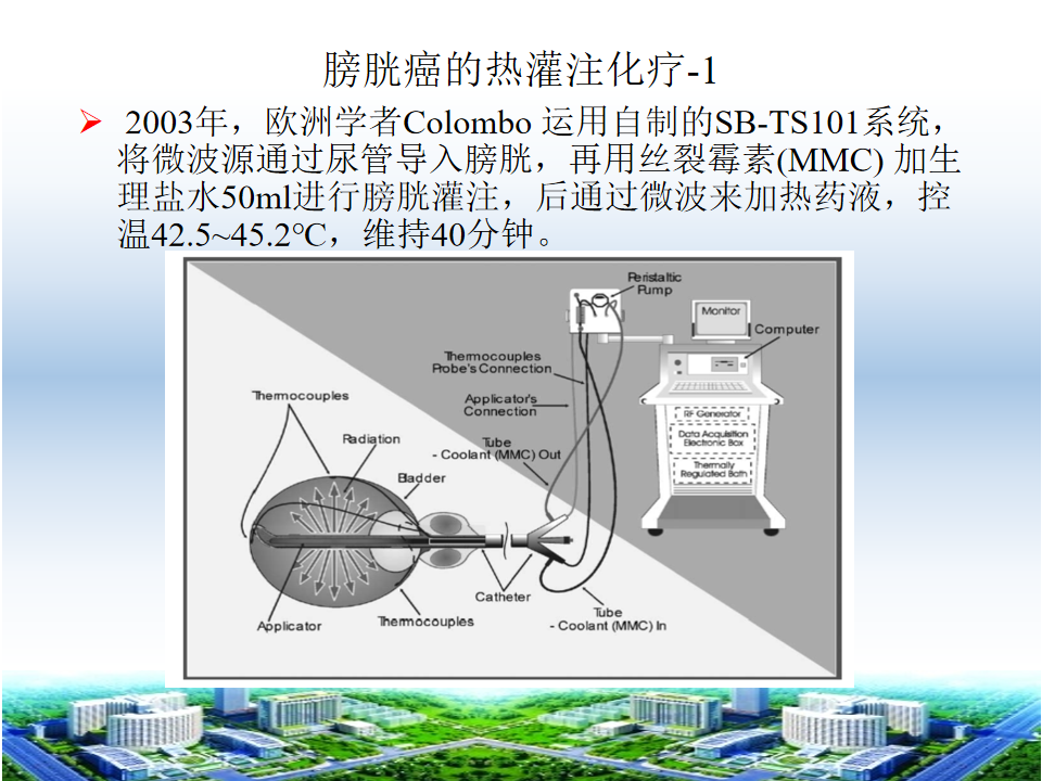 膀胱热疗最早应用于1974年,Hall首先报导用高温治疗膀胱癌,并取得一定疗效 1982年,卫焘教授使用膀胱热灌注治疗10例膀胱癌患者:将等渗盐水加热至52℃,通过导尿管灌注膀胱,在膀胱内保留15-20分钟后放出灌注液,要求排出液的温度在40℃左右。如此反复灌注10次,一次治疗耗时约4个小时。灌注后复查膀胱镜,6例患者有效(3例肿瘤完全消失,3例肿瘤体积缩小)。热灌注和化疗怎么结合的呢?将大容量灌注液或是含有化疗药物的灌注液加热到一定温度,并持续循环恒温灌注入患者体腔(胸腔、腹盆腔、膀胱)内,维持一定时间,通过热化疗的协同增敏作用和机械冲刷杀灭和清除体腔内残留癌细胞及微小病灶的一种新的肿瘤治疗系统。热疗与化疗之间具有协同作用。在热疗杀伤肿瘤细胞的同时也增加机体对化疗药物的敏感性,能更有效的杀伤肿瘤细胞,二者产生1+1>2的效果。膀胱热灌注化疗主要应用于:1 )各种浅表性膀胱肿瘤保留膀胱术后预防性治疗;2)浸润性膀胱癌的术前配合治疗;3)患者身体情况差,不能进行手术或患者不愿意接受手术的多发性浅表性膀胱肿瘤。4)不能耐受手术的浸润性膀胱癌的姑息性治疗;5)腺性膀胱炎患者。