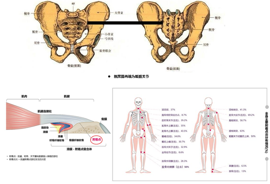 那什么是强直性脊柱炎(Ankylosing spondylitis,AS)呢? 强直性脊柱炎是脊柱关节炎(SPA)的原型,年轻男性多发,它是一种慢性炎症性疾病,主要侵犯骶髂关节(下图上)、脊柱、脊柱旁软组织及外周关节(除脊柱与骶髂关节,如髋、膝、肩、踝关节等),严重者可发生脊柱畸形和强直,可伴发关节外表现。AS的特征性标志和早期表现之一为骶髂关节炎,本病的特征性病理改变为附着点炎(下图下),脊柱受累晚期的典型表现为“竹节样改变”,这是导致脊柱强直、不能自由活动的原因。其中的关节外表现包括会引起眼红、眼痛、畏光、流泪、视物模糊的虹膜炎;可能合并的炎症性肠病或银屑病;少数可能出现的肺上叶纤维化、主动脉瓣关闭不全及心脏传导障碍,部分可发生的肾淀粉样变和IgA相关性肾病。还想和大家说说HLA-B27,AS患者中80-90% HLA-B27阳性,普通人群中6-8% HLA-B27阳性,所以HLA-B27阳性并不意味就是AS。HLA-B27阳性的AS患者其HLA-B27阳性的后代有30%的患病风险。已经发现的HLA-B27等位基因有200种左右,其中HLA-B27:04和HLA-B27:05和我国AS强相关。