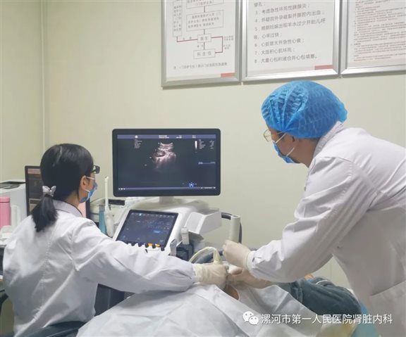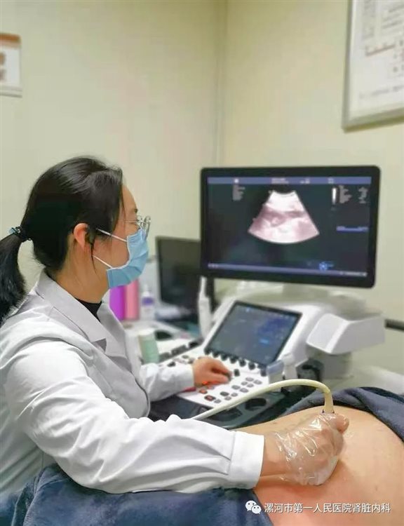 2021年3月初的一天下午,一个普通的日子,但对于漯河市中心医院肾内科患者侯XX来说,却是个难忘的时刻。近日发现全身水肿的他,在当地查尿蛋白(+++),因为特殊体型(肥胖,体重达112kg),由驻马店市某县专程赶来我院肾内科行肾活检以明确诊断。住院后,经完善检查,主管医生张翠翠副主任医师测算患者体重指数(BMI)33,属于严重肥胖,评估病情,诊断肾病综合征明确,组织完成了肾穿刺术前讨论,联系住院部超声科王永莉主任,评估患者体重和双肾彩超等情况,认为手术可行。入院仅仅一两天,即由肾内科主任杜跃亮主任医师亲自操作,张翠翠副主任医师协助,彩超室宋小璐主治医师彩超引导定位,大家团队配合,顺利完成了此患者的肾穿刺活检术。术后一天复查肾脏彩超也未见出血并发症,肾活检手术取得圆满成功。