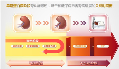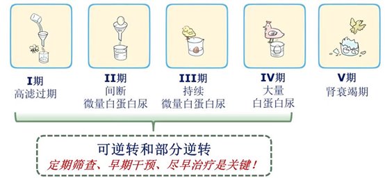 资料显示,全球有20%-40%的糖尿病患者合并患有糖尿病肾病。我国2型糖尿病患者的糖尿病肾病患病率约21.8%。糖尿病肾病的发展是一个慢性隐匿的过程,早期临床无明显肾病表现,肾脏结构基本正常。之后随着蛋白尿的出现和肾小球滤过率下降,肾脏结构出现明显异常。此时若加以治疗,病情可以逆转。但如不进行及时干预,进展到终末糖尿病肾病,多数已不可恢复。因此,强调糖尿病肾病的早期筛查和诊断。