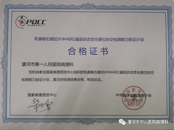近日,我科乳腺癌HER2、胃癌HER2基因荧光原位杂交检测项目以优异的成绩通过国家病理质控中心验证,被授予合格证书。我科自2020年开展Her2分子检测项目后,先后多次获得省内质控合格证书,今年5月首次参加国家病理质控中心(PQCC)组织的2021年全国乳腺癌Her2和胃癌Her2基因状态荧光原位杂交检测能力验证,即以优异的成绩通过检测。