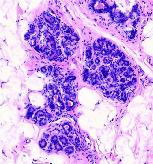 乳腺纤维腺瘤与周围正常腺体组织分界清楚,显微镜下可见其由良性的乳腺上皮和间质成分增生形成,细胞形态温和,无异型性。根据组织形态,可大致分为管内型和管周型,但分型对临床预后并无显著影响。该肿瘤经完整手术切除后,一般不会复发。
