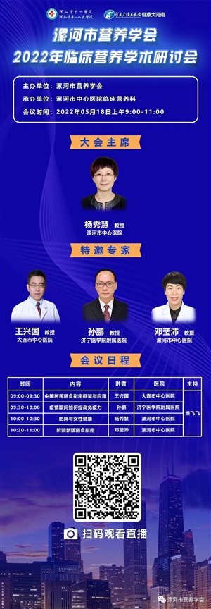 为进一步提高漯河市临床营养专业技能水平,由漯河市营养学会主办,漯河市中心医院(漯河医专一附院)承办的“2022年临床营养学术研讨会”将于2022年5月18日线上举行,届时大会将邀请国内著名临床营养专家,心内科专家进行学术讲座,并进行学术讨论。欢迎省级、市级、县级及社区医院医务人员、营养专业或营养相关专业的同仁扫码参会,共同学习交流。
