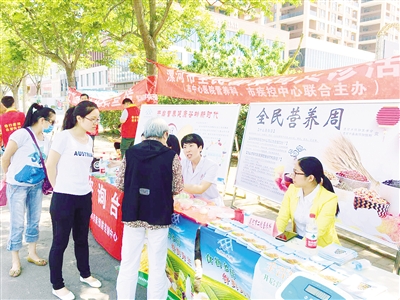 本报讯(文/图 见习记者 刘彩霞)为全面贯彻落实《“健康中国2030”规划纲要》,宣传营养健康理念,传播正确营养知识,促进我市居民身体健康,5月17日上午9时,漯河市中心医院营养科与漯河市疾控中心、市二院、市三院、市六院和郾城区人民医院的营养科医护人员,在双汇广场联合开展2017年漯河市全民营养周大型科普义诊活动(如图)。