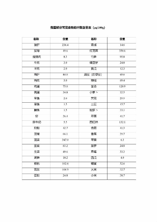 从上表中可以看出,孕妇对于叶酸的需求量是最高的。叶酸对于孕妇的重要性上文也有提到,一般建议在怀孕前三个月即开始口服补充叶酸制剂(400μg/d),并至少持续到怀孕前三个月(即孕早期),也可持续整个孕期。另外多摄入含叶酸丰富的食物,具体食物含量如下: