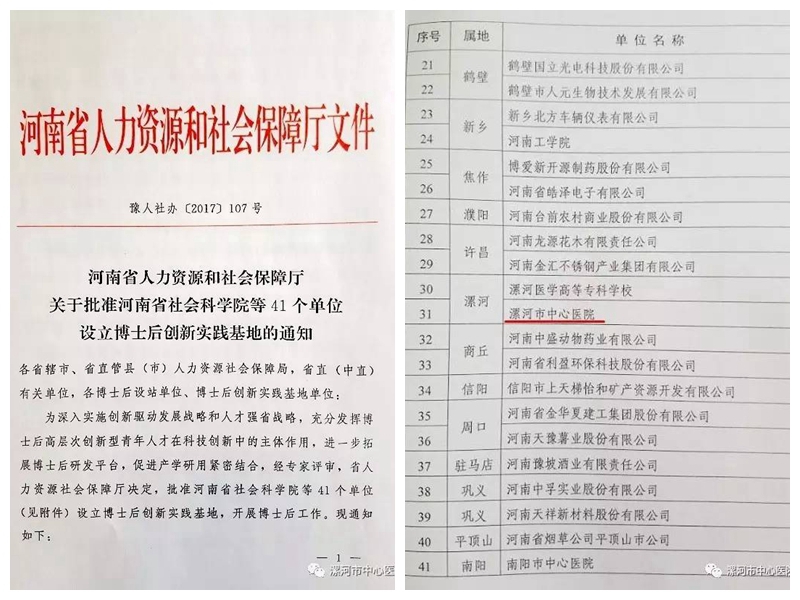 7月13日,河南省人力资源和社会保障厅下发通知(豫人社办[2017]107)号,在全省评审出41家单位设立博士后创新实践基地,开展博士后工作,我院获批成为河南省博士后创新实践基地。博士后创新实践基地是招收博士后人员进站从事博士后研究的重要平台,是高层次人才培养的特有形式,也是检验一个单位是否具有较高科研水平、成果转化和科研实力的“金标准”。此次获批设立博士后创新实践基地,标志着我院在学科建设和科研方面缺了突破性进展。