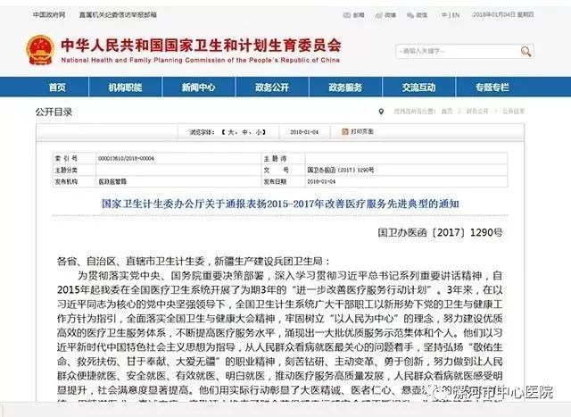 1月3日下午,2018年全国改善医疗服务工作会议在北京召开,全面总结2015-2017年改善医疗服务行动,研究部署2018-2020年有关工作。会议宣读了2015-2017改善医疗服务先进典型通报表扬文件,我院副院长杨秀慧被授予“改善住院流程示范个人”。