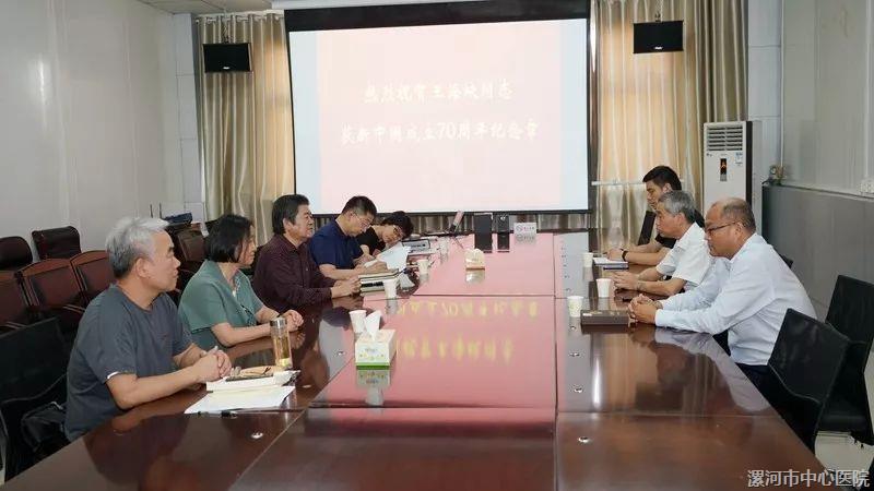 9月26日下午,市人大常委会副主任、总工会主席陈平,总工会副主席张振凡来到我院,慰问全国劳动模范、市中心医院院长王海蛟,并代为颁发了中共中央,国务院,中央军委联合授予的“庆祝中华人民共和国成立70周年纪念章”。市中心医院党委书记王向良,副院长付秀虹,纪委书记张丰月,工会主席刘东亮出席颁发仪式。