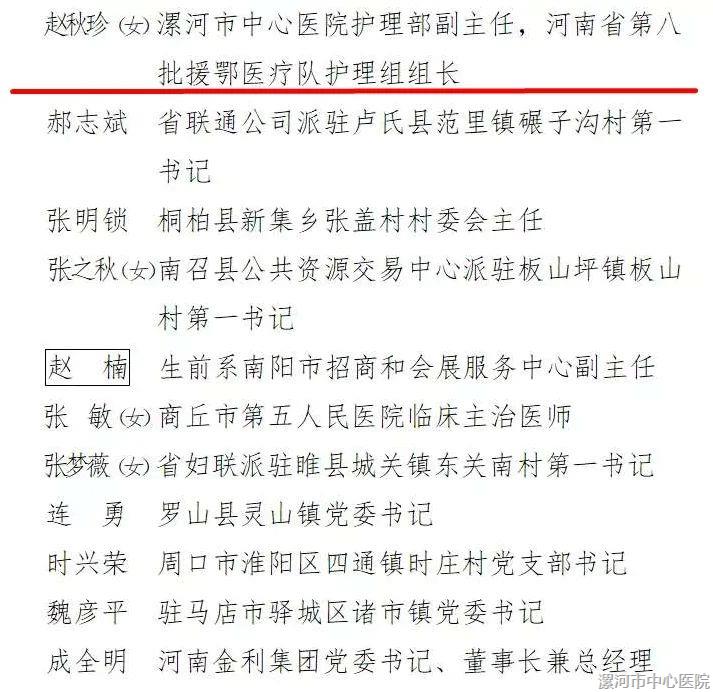 4月21日,河南省委组织部通报表扬了第五批36名在疫情防控工作中表现突出的共产党员。我院护理部副主任、河南省援鄂第八医疗队护理组组长赵秋珍名列其中。