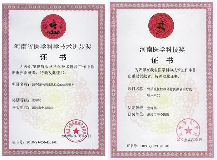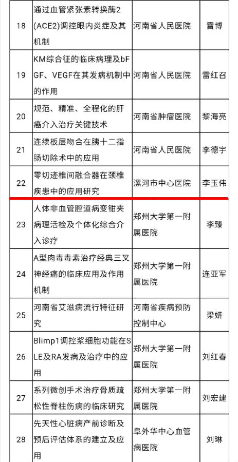 2020年河南医学科技奖揭晓,我院脊柱外科副主任、主任医师李玉伟主持的《零切迹椎间融合器在颈椎疾患中的应用研究》项目荣获2020年河南医学科技奖一等奖,这是漯河市中心医院骨科连续三年荣获省级一等奖,同时也是全省地市级医院连续三年获得一等奖的医院!