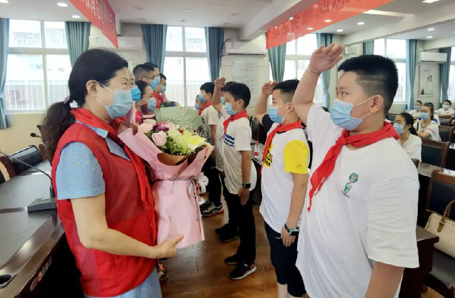 讲座结束后,少先队员代表为抗疫英雄和医疗团队成员佩戴红领巾,并为他们送上了鲜花。