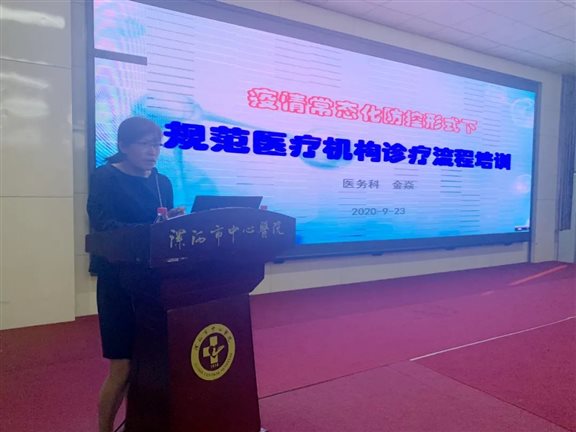 医务科副科长金焱以《疫情常态化防控形势下规范医疗机构诊疗流程》为题,讲明了疫情防控期间规范设置预检分诊和发热门诊、坚决落实门急诊预检分诊制度、加强发热患者闭环管理,医院内加强组织协调、建立急危重者救治通道,全力做好医疗救治工作,临床科室统筹做好疫情防控常态化形势下,如何一手抓疫情防控,一手开展正常医疗服务工作,规范诊疗流程。