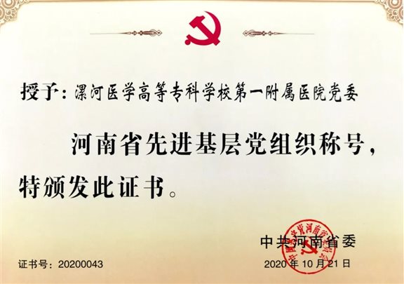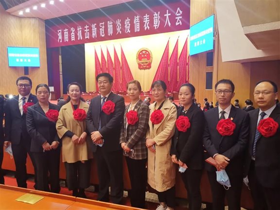 在河南省抗击新冠肺炎疫情表彰大会上,漯河医专一附院(漯河市中心医院)党委荣获“河南省抗击新冠肺炎疫情先进集体”称号和“河南省先进基层党组织”称号,副院长李耀军荣获“河南省抗击新冠肺炎疫情先进个人”称号,护理部副主任赵秋珍荣获“河南省抗击新冠肺炎疫情先进个人”称号和“河南省优秀共产党员”称号。