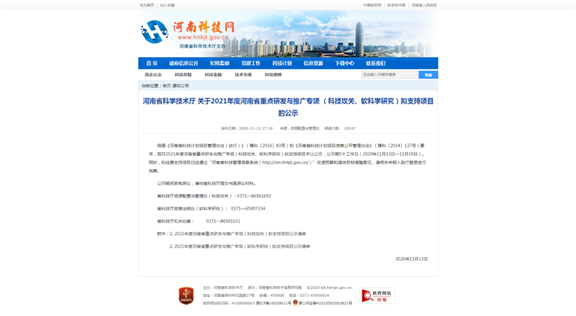 河南省重点研发与推广专项(科技攻关、软科学研究)是河南省科技厅、财政厅为深入实施创新驱动发展战略,加快开展支撑经济社会发展的关键共性技术研究与开发及政策、措施、路径等研究,助推全省经济高质量发展,而专门设立的省级科研项目。