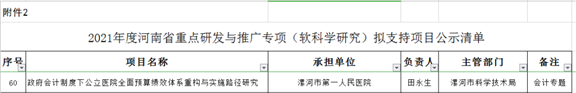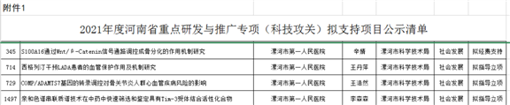 近日,河南省科技厅公布了《河南省科学技术厅关于2021年度河南省重点研发与推广专项(科技攻关、软科学研究)拟支持项目的公示》。漯河市中心医院共获批立项5项,在全省90多家三级医院排名中位居第6位,地市级医院中位居第2位!