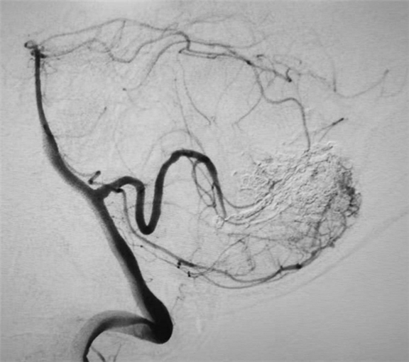 栓塞术后造影动脉瘤致密栓塞,小脑畸形血管团消失,术后患者恢复良好