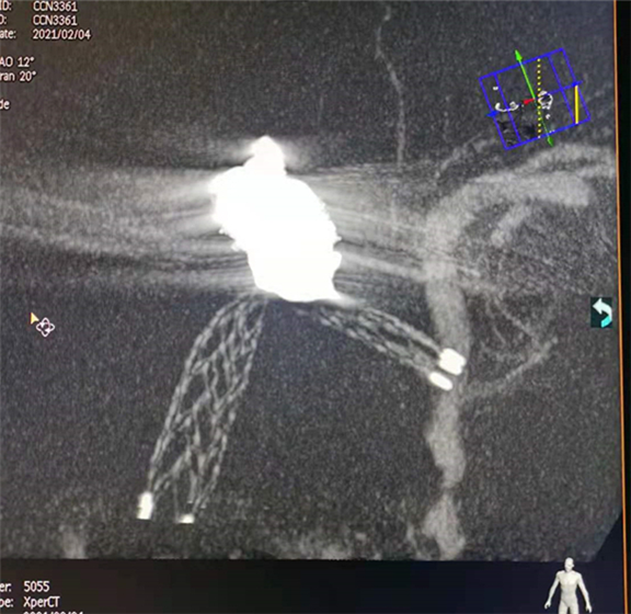 该血管造影机能够明显提高图像质量,对于复杂畸形和较小的腔内器材(如颅内血管微支架等)的显示更具优势。使医生在血管造影及介入手术中可以看到更多的临床影像细节,使微血管和细小病灶得以更加清晰的显示,同时又兼容心脏与外周介入的综合需求,还兼具增强CT功能,可以进行三期扫描,清晰显示病变和微细血管。
