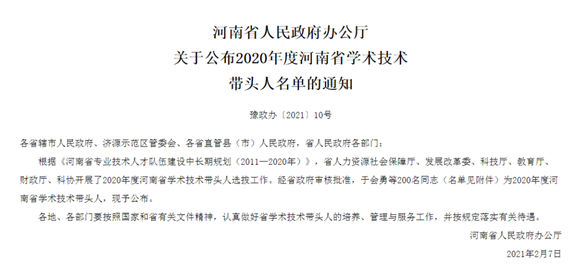 根据《河南省专业技术人才队伍建设中长期规划(2011—2020年)》,省人力资源社会保障厅、发展改革委、科技厅、教育厅、财政厅、科协开展了2020年度河南省学术技术带头人选拔工作。近日,经省政府审核批准,于会勇等200名同志评为2020年度河南省学术技术带头人,现予公布。