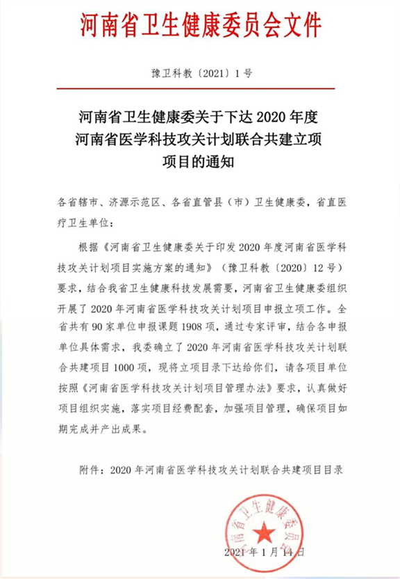 这次河南省医学科技攻关计划联合共建项目顺利获批,标志着我院科技创新能力和学术水平进一步提高,我们将严格按照要求,认真踏实的工作,积极创新和探索,进一步提高自身医学技能和科研能力,为科研提供强有力的保障!