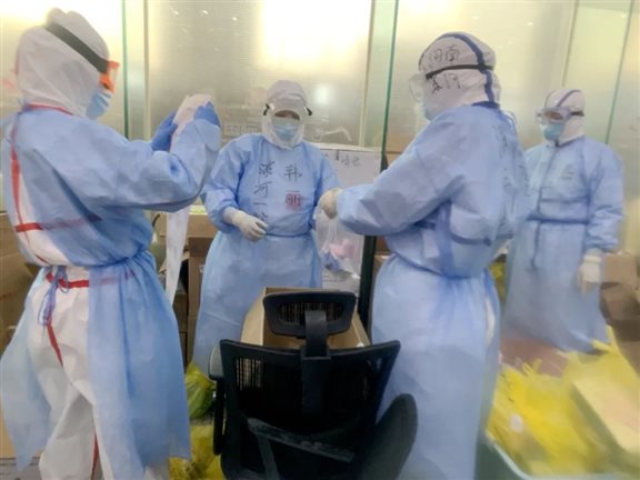 韩丽清楚的记得第一次进舱经历。穿上防护服、戴上N95口罩、防护眼镜后原地不动都感觉胸闷、气短、头晕、恶心,好似高原反应,连简单的蹲下起身动作都十分费力。即便如此,韩丽第一次进舱就先后分发了100箱中药、1715份盒饭和23箱香蕉,每一个数字她都记得清清楚楚,因为每一项任务的完成都无比艰巨,经常累得上气不接下气,全身湿透,汗水顺着护目镜啪嗒啪嗒往下滴。而刚发完了一项物资另一项物资又来了。