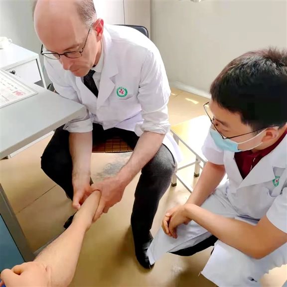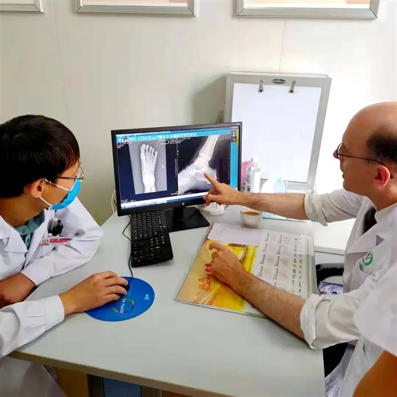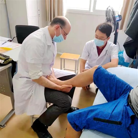 上午9点,Dannel Porter教授为每一位患者的病情,仔细进行骨科专科的查体。3个多小时的时间里,Dannel Porter教授对踝关节损伤、膝关节损伤、小儿髋关节疼痛等10余位患者进行了初步诊断并根据个人情况提出了个性化治疗意见。在赢得患者信赖的同时,他渊博的学识和严谨的工作态度令在场的医务人员深感敬佩。