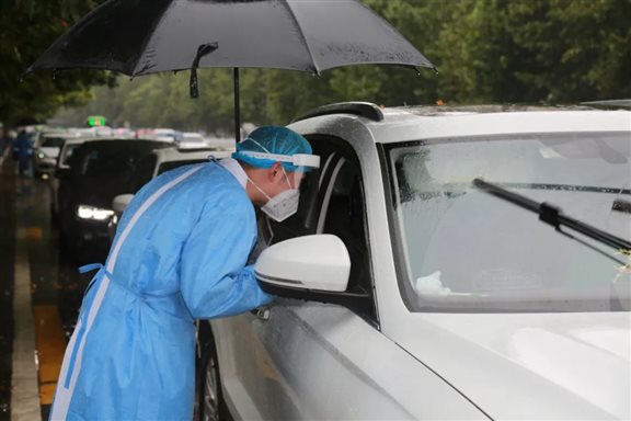 上午十时许,大雨倾盆,在人民东路接近医院北门的辅道上,车辆正有序排队入院,“全副武装”的院前引导员、2021级新入职员工王森在路旁撑着伞提醒即将入院的群众:“请您佩戴好口罩并出示防疫健康信息码”。这是疫情中群众入院的第一道“关卡”,在核查过患者健康信息后,王森挥手致意车辆通行。