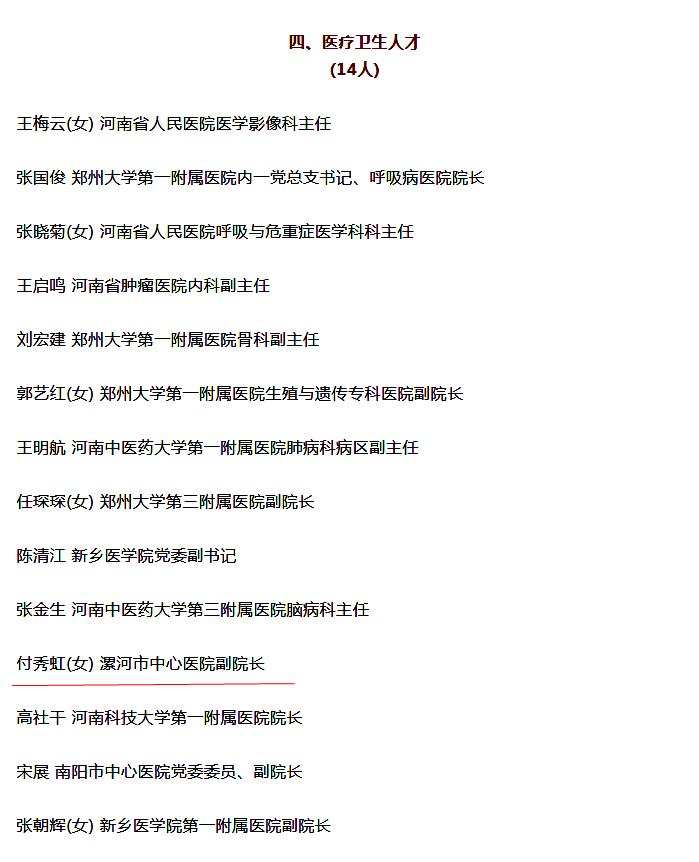 漯河市中心医院副院长付秀虹(女) 作为医疗卫生人才入选;