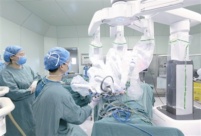 市中心医院医生正在利用“达芬奇”手术机器人进行手术