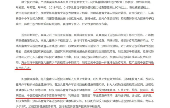 方案中明确提到:要充分发挥中医药在儿童青少年近视防治中的作用,制定实施中西医一体化综合治疗方案,推广应用中医药特色技术和方法,充分发挥中医药相关领域专家的指导作用。