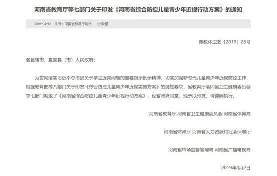 根据教育部等八部门关于印发《综合防控儿童青少年近视实施方案》的通知要求,河南省教育厅会同省卫生健康委员会等七部门制定了《河南省综合防控儿童青少年近视行动方案》。