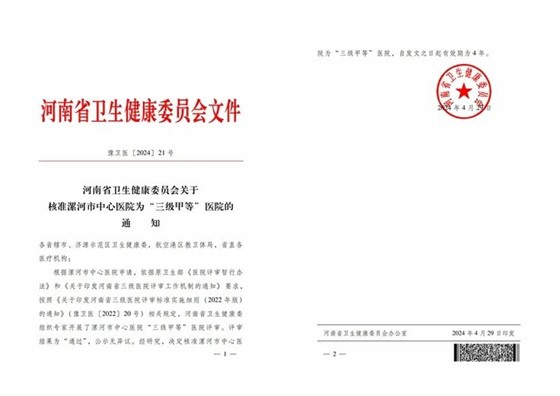 2024年4月29日,喜报传来,省卫健委发布了《河南省卫生健康委员会关于核准漯河市中心医院为“三级甲等”医院的通知》,标志着漯河市中心医院顺利通过了国家“三级甲等”综合性医院复审。