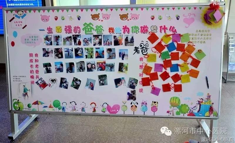 父爱是如此的含蓄,不像母爱来得那么明显。我们用隆重的典礼欢祝母亲节的到来,但是,又有多少人知道父亲节是哪一天呢?其实,父亲不需要任何花哨的礼物,父亲只希望自己的孩子能够健康快乐的成长。我们和父亲之间,就总是这样心息相通,却又默默无言。但这并不代表父爱就可以被忽略。在父亲节即将到来的日子里,医院职工和病患家属踊跃的参与到父亲节的活动中来,纷纷在展板上贴上了爸爸和孩子们幸福瞬间的照片,出生时爸爸第一次抱我,出嫁时爸爸送我出家门,我陪爸爸去散步,爸爸教我包饺子,爸爸生病住院我一直陪在身边等等很多珍贵的照片,大家还各自为父亲们在留言板上写上了祝福语和心里话,让所有人感受到来自不同家庭的却又相同的父爱。