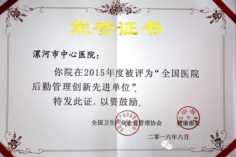 近日,第二届全国医院后勤改革发展大会在北京隆重召开。会上,漯河市中心医院被授予“2015年度全国医院后勤管理创新先进单位”称号。