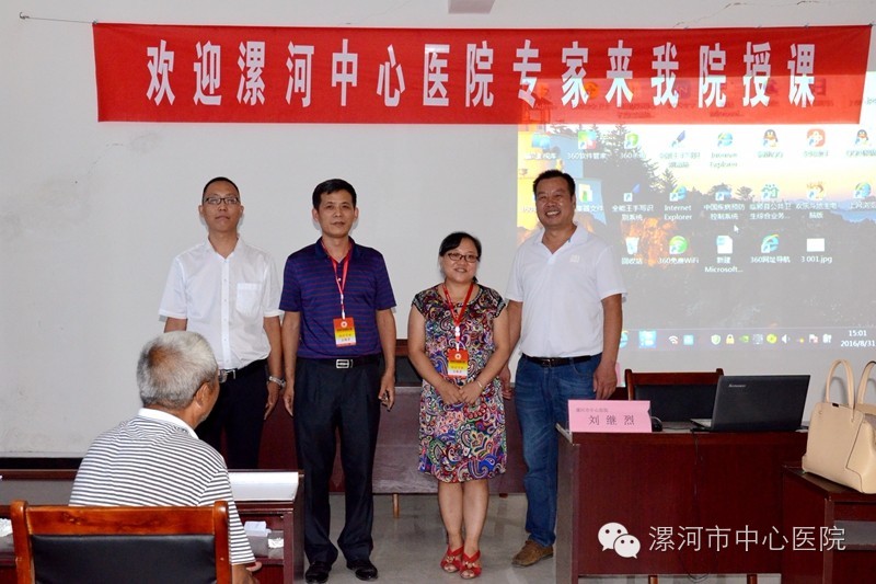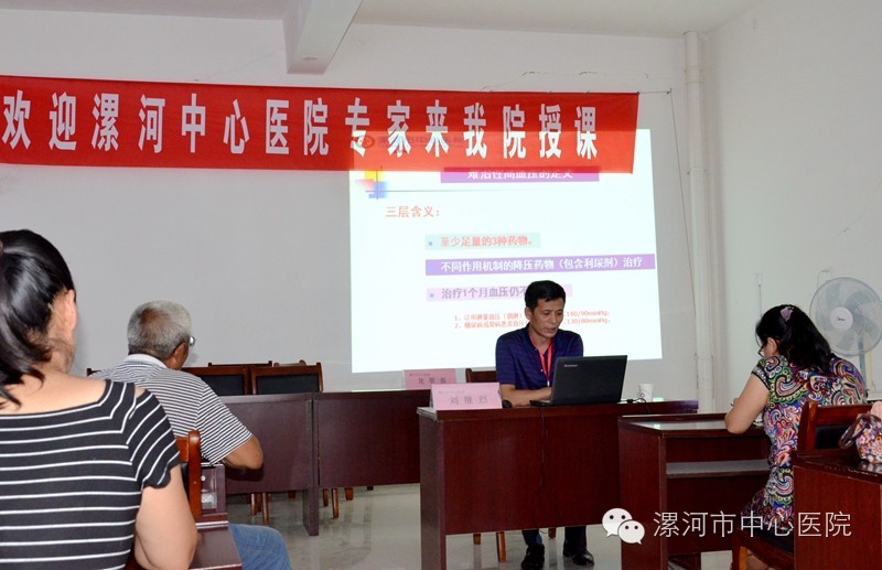 市中心医院高血压科主任刘继烈详细讲解了高血压病症的表现特征,并结合乡镇卫生院及村医的诊治水平和实际工作情况,讲授简单易行且可靠的诊断及用药方法。刘继烈主任指出,人体健康预防工作重于治疗,并在课堂中与大家积极热情的交流经验。