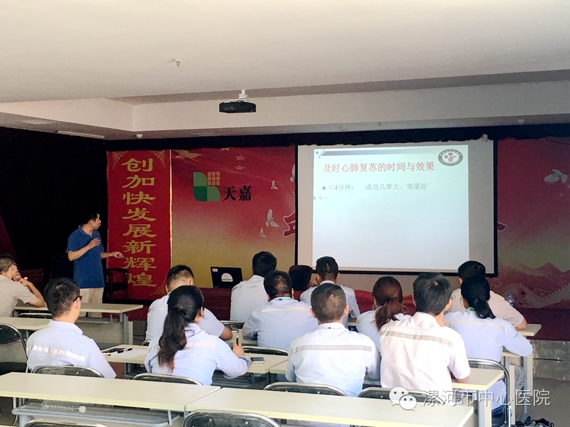 企业作为社会结构中的重要组成部分,生产现场心脏骤停后的心肺复苏急救意义非凡。冯亚民等在天嘉生化有限公司培训时指出,心肺复苏急救关键在于把握急救“黄金四分钟”,就如何判断心脏骤停、确认急救操作环境条件、急救操作流程、注意事项等,冯亚民等在理论知识讲解、模特模拟演练展示之后,又一对一对天嘉公司14员工的模拟急救操进行当场指导。