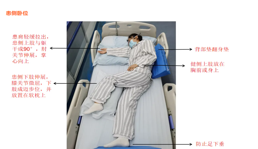 5、定时变换体位,任何一种体位均不可超过2h,防止压疮的发生。变换体位时动作要轻柔,切勿托、拉患侧肢体,尤其肩关节,防止造成患者二次伤害。