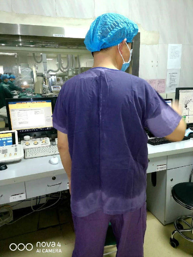 此时,大家身穿着30多斤的铅衣,距离第一台急诊手术已经过去了14个小时,由于大量出汗,铅衣下的手术服都已经湿透了,病情危急,来不及换下,宋主任重新披上铅衣走上了手术台,经过4个多小时,栓塞微导管在微导丝的引导下置入动脉瘤体内,采用支架辅助技术对动脉瘤进行栓塞,即刻造影显示支架内血流通畅,邻近血管未受影响,动脉瘤栓塞满意,手术圆满成功。