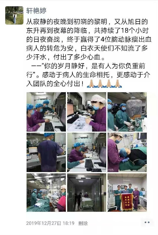 “从寂静的夜晚到初晓的黎明,又从旭日的东升到夜幕的降临,共持续了18个小时的日夜奋战,赢得了4位颅内动脉瘤出血病人的转危为安。”手术过后,轩艳婷在朋友圈发出的这段文字,让大家感慨不已。