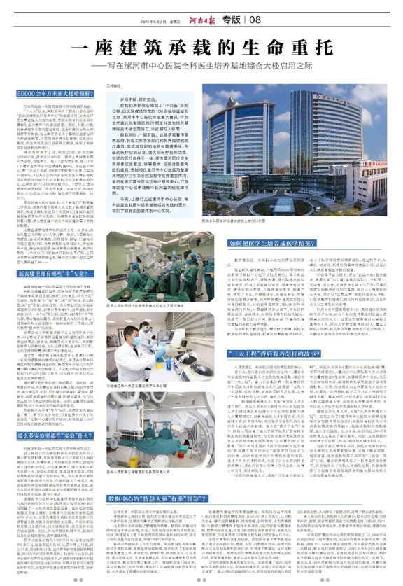 6月2日,《河南日报》以《一座建筑承载的生命重托》为题,整版报道了漯河市中心医院全科医生培养基地综合大楼启用后对医院亚专科建设、现代医学高精尖技术开展和教学科研能力提升,打造区域性医疗服务中心的重大推动意义。