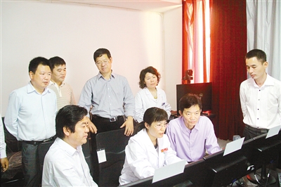 图为市卫计委主任吴书清察看市中心医院远程诊断服务系统建设情况