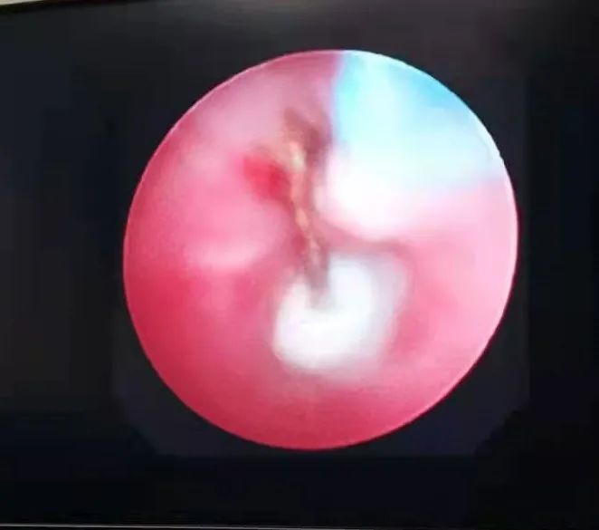 气管镜下可见异物一端刺入气管黏膜,触之有出血,因异物一端较锐利,另一端完全阻塞气管,“取异物的过程中随时可能造成大出血、异物刺入其他部位造成二次损伤,甚至可能造成气胸、异物取出失败等。”最后在耳鼻喉科袁宏伟主任、麻醉科李宪营主任带领支气管镜团队共同努力下,成功取出异物,异物为一生锈铁钉,一端为带白色塑胶帽,一端较尖锐,取出后可见气管黏膜破损明显,较多黄白色分泌物附着,予相对处理后未见明显新发出血,分泌物减少,患儿清醒后各种症状明显好转。