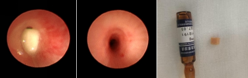 至此,导致患儿咳嗽、喘息的“真凶”终于找到了------“支气管异物--火腿肠”。