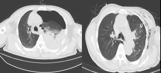 患者于某某,6月15日凌晨04时急诊入院,胸部CT提示左侧大量液气胸,左肺被压缩约80%,纵隔受压右偏。询问病史,否认外伤史,只是在入院前一天咳嗽后突发胸痛伴呼吸困难。值班医生付东林紧急行床旁胸腔闭式引流术,引流出大量气体及血性液体约1500ml,心胸外科副主任马广耀组织科室团队成员紧急进行讨论后,一致决定积极完善术前准备,急诊全麻下行胸腔镜探查术。