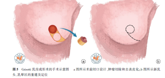 Clough在2010年提出“逐个象限”解剖分类法,将肿瘤整形保乳分为二个水平。Level I技术用于切除乳腺体积小于总体积的20%,使用简单的腺体瓣上提和旋转技术来纠正小范围的缺损而重塑乳房外形。Level II技术则是切除超过20%,低于50%的大范围组织切除,需使用腺体成形技术和皮肤切除技术,对不同位置的肿瘤根据解剖特点予以手术处理。即便有些肿瘤体积稍大,通过Level II技术做大范围的切除后,再予以缩乳成形,仍可保留乳房,获得很好的美观度。常用的Level II技术包括Le Jour(上蒂技术)、Wise pattern(下蒂技术)、“网球拍”、“蝙蝠翼”技术、J形、V形技术、Grisotti皮瓣技术等,适用于不同象限的肿物。对于不适合肿瘤整形容积移位的患者,如小乳房,肿瘤多中心病灶范围广等,可做部分乳房切除,采用容积替代技术,如背阔肌肌瓣、腰动脉穿支游离瓣、大网膜等技术。