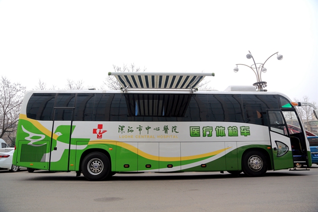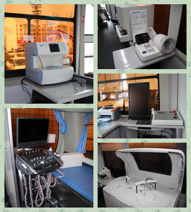过去,传统的体检方式是体检者来到医院,路途的奔波、耗时的等候、分散的科室等体检过程过于繁琐;现在,这台豪华温馨、设施齐全的移动医疗体检车解决了上述所有难题,她能提供全面的体检项目服务,满足各种人群的体检需要。车上配置了多种领先的仪器设备:如DR数字化摄影系统(可以拍摄胸片、腰椎片等)、心电图机、骨密度测定仪、彩超检查、全自动生化分析仪、五分类血细胞、电脑尿液分析仪及多功能检查床、全自动血压计等先进医疗仪器设备,并配备有中央空调为体检者和工作人员营造舒适的环境。该车还配有网络系统,检查结果可以直接传回医院的信息系统,院内专家能够实时地远程诊断指导。