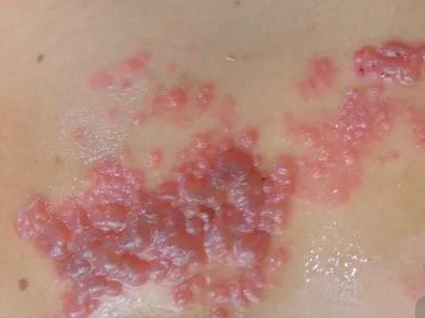 后患处皮肤出现潮红斑,及米粒至黄豆大小的丘疹,簇状分布而不融合,继而迅速变为水痘。皮损沿某一周围神经呈带状排列,多发于身体一侧。好发部位依次为肋间神经、颈神经、三叉神经和腰骶神经支配的区域。