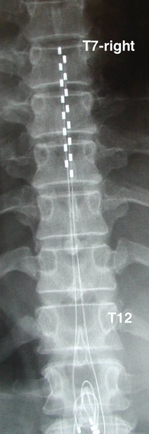 第一阶梯: 如果您的后遗神经痛对脉冲神经调控治疗反应良好,恭喜你,您中奖了,您的花费可能是数千元。手术在CT引导下进行,将电极定位到背根神经节,对受损神经进行调控: