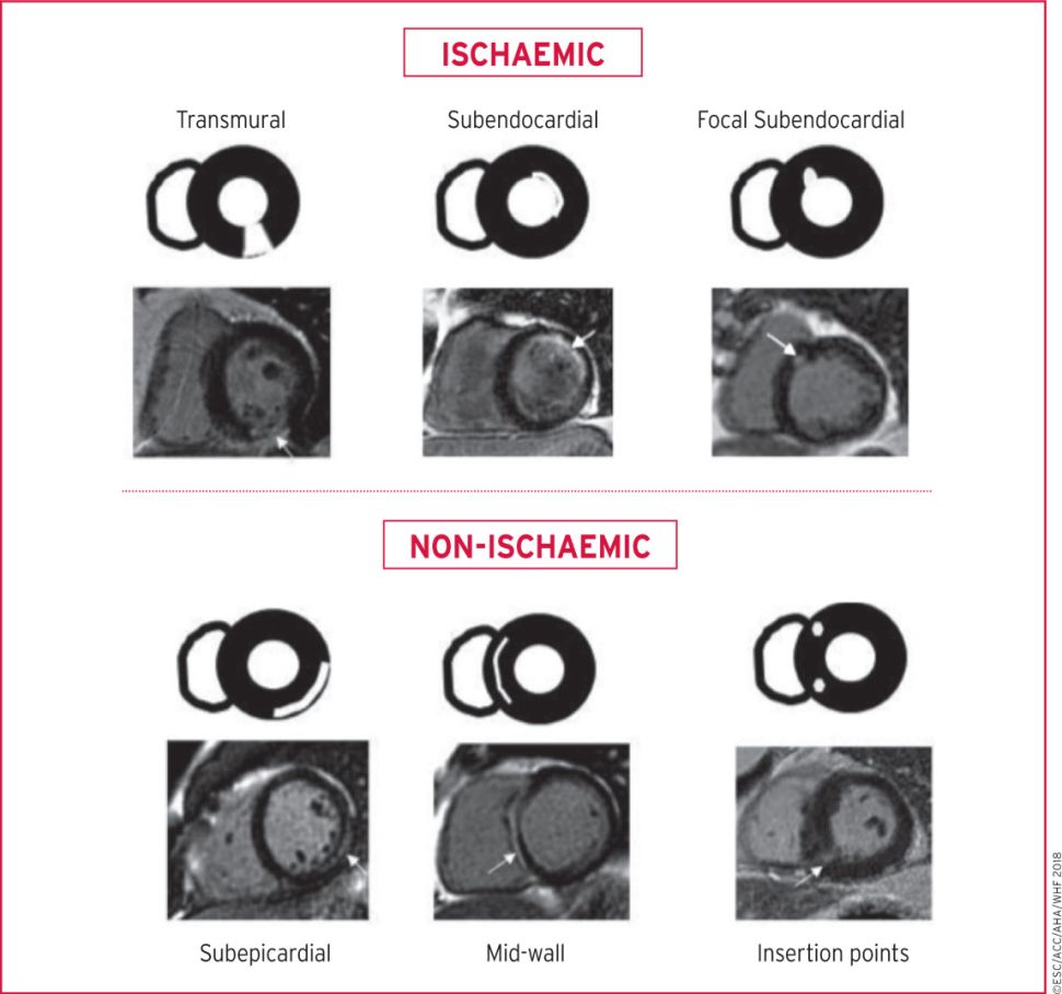 图1:瘢痕区(白色箭头)的不同形态分为缺血性和非缺血性;通常,典型缺血型瘢痕/纤维化(上层)从心内膜延伸至心外膜(心内膜下非透壁瘢痕与透壁瘢痕);反之,非缺血型瘢痕/纤维化(下层)可见于心外膜、中层或右心室的插入点。