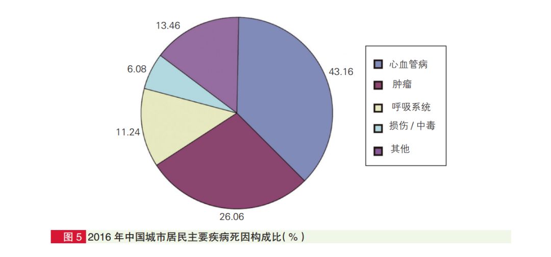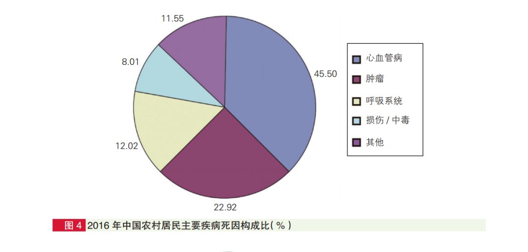 2016 年,农村心血管病死亡占全部死因的比率为 45.50%,城市心血管死亡占全部死因的比率为 43.16%。